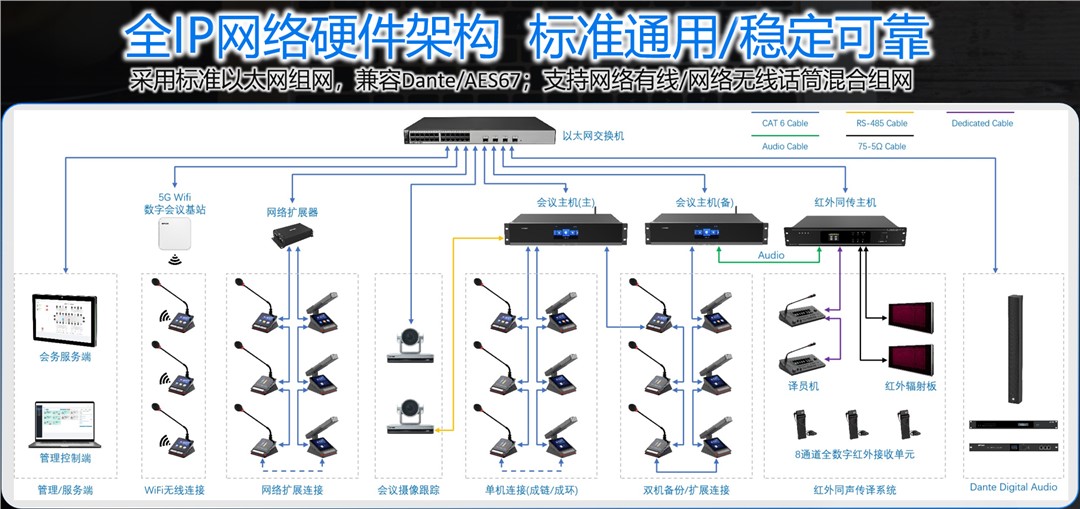 在专业会议室建设中,组网方式直接决定了系统的稳定性、施工难度及后期维护的便利性。传统架构主要分为“手拉手”与“星型”两种,而现代高端系统正向“有线+无线”的融合架构演进。