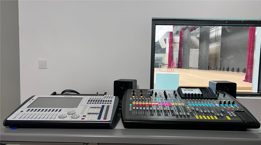 视线转至场馆后方的控制室,这里是整套系统的“神经中枢”。 透过观察窗,我们可以看到操作台上部署了专业数字调音台与灯光控制台。与传统模拟设备不同,这套数字化系统具备强大的“场景记忆”功能。老师们可以预设多种模式——按下“会议模式”,灯光柔和,人声突出;切换“竞赛模式”,全场通亮,音乐激昂;选择“演出模式”,声光联动,特效全开。 这种高度集成的智能化设计,不仅简化了繁琐的操作流程,更让每一次活动的声光配合都精准无误,真正实现了用科技为校园文体生活赋能。