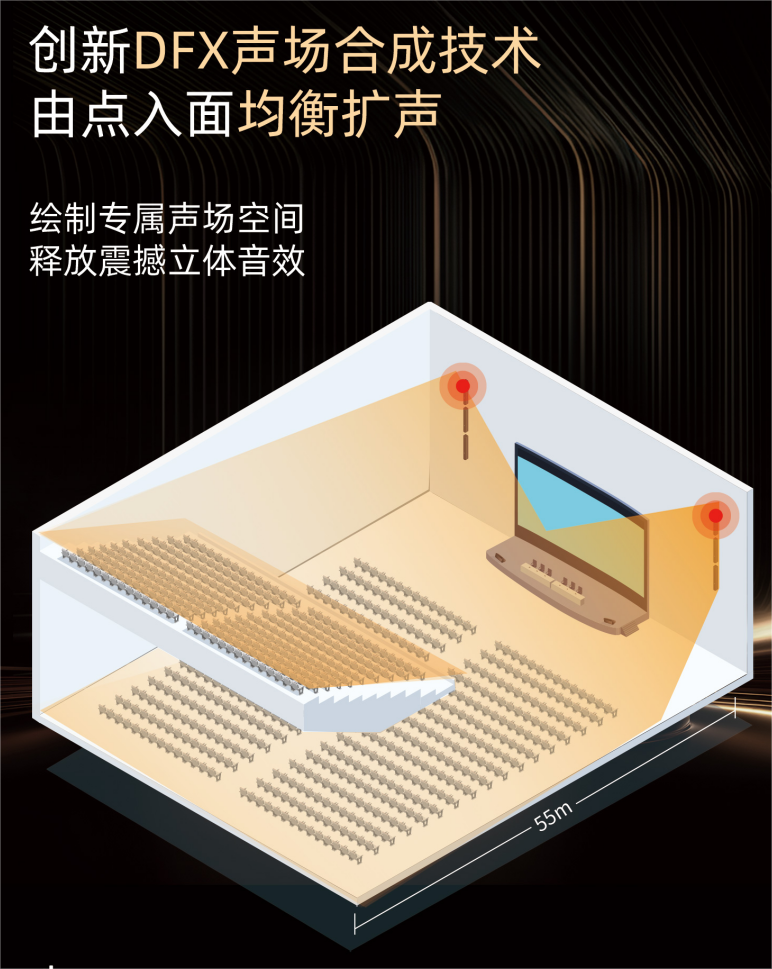 针对上述方案的痛点,世邦(SPON)推出的可调指向线性阵列音柱为中大型会议空间提供了更优的解题思路。与传统方案相比,其核心优势在于引入了先进的DFX声场合成技术。