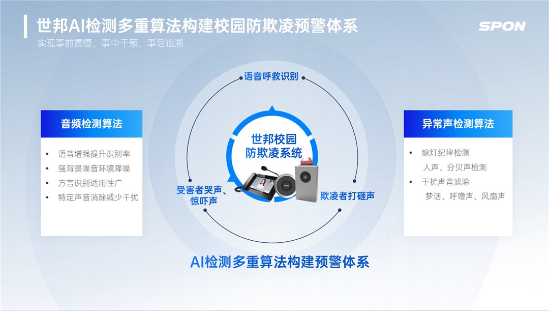 世邦通信的方案并未单纯依赖某一模式,而是融合了 “AI智能音频分析+一键求助”的双重机制,针对防欺凌做出了针对性优化: