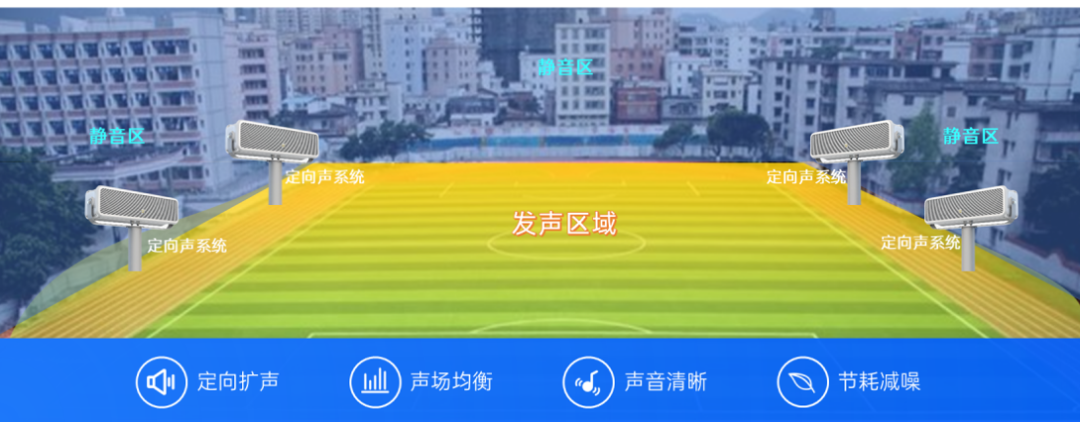 定向声的技术原理是利用波束形成技术,对各扬声器的播音信号进行相位调整,将播音能量的“主波束”调整集中到指定方向,音源播放角度收窄,使广播的声音只覆盖操场主区域,减少对操场外围区域的声音辐射。
