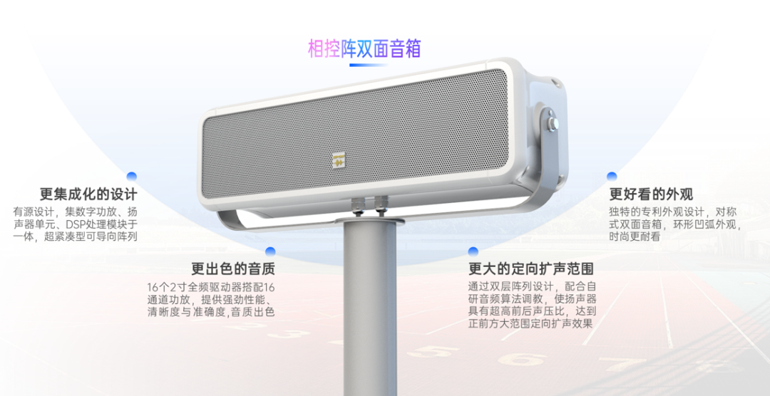 世邦超指向双层音柱在定向声算法技术之上,独创双层式阵列设计,扬声器“背靠背”对称排列,通过背面扬声器声场抵消正面向后的发声,不仅解决背部声场难控的难题,抵消的同时,还对正面声场进行加强,即“声场重建”,形成音柱前后方超高声压差,现场实测操场和操场外围声压比35dB,真正做到广播声音精准覆盖操场区域。